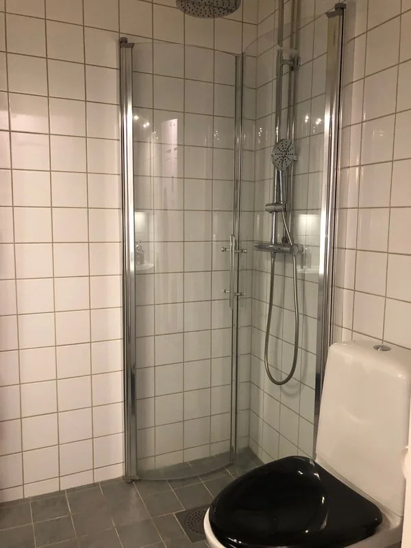 Nowadays here in Sweden, many homeowners decide to opt for recessed doors that can fold towards the wall if you have a corner shower, like mine here below. I think this is a great solution to allow a bit of extra space when not using the shower.