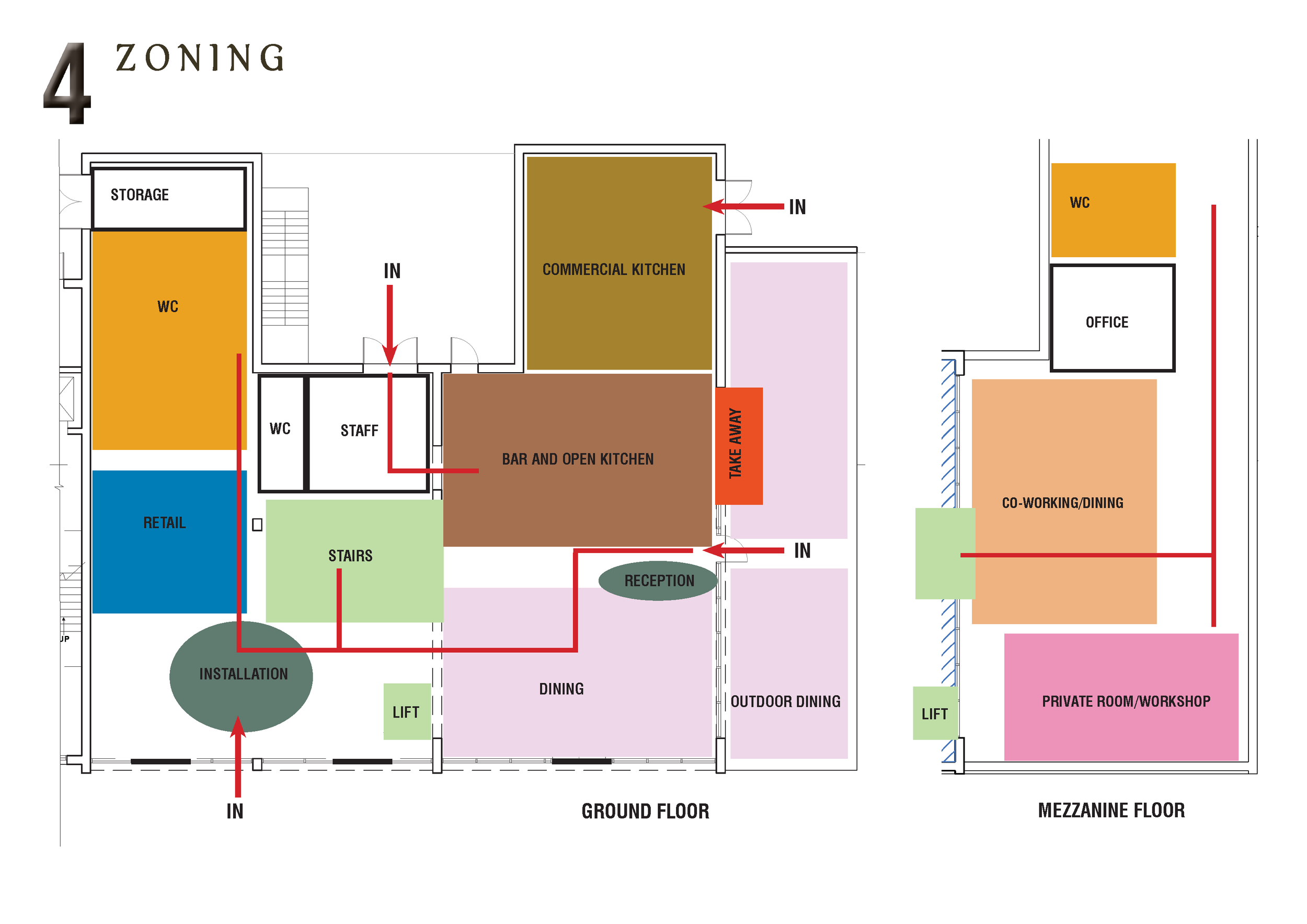 For the final project of the second year of my BA (Hons) in Interior Design at KLC School of Design in London, I chose to design a hospitality space for a young brand of vegan kimchi based in Hackney, London. The brief included the first physical store, as well as a dining space and additional functions according to the needs of the local population. The building was a fine example of adaptive re-use, from an old Georgian style warehouse, with typical façade in red bricks. The space allowed for the construction of a first floor for a total of approximately 800 sqm. Accessibility and UK building regulations had to be kept in consideration for the safety of the guests.