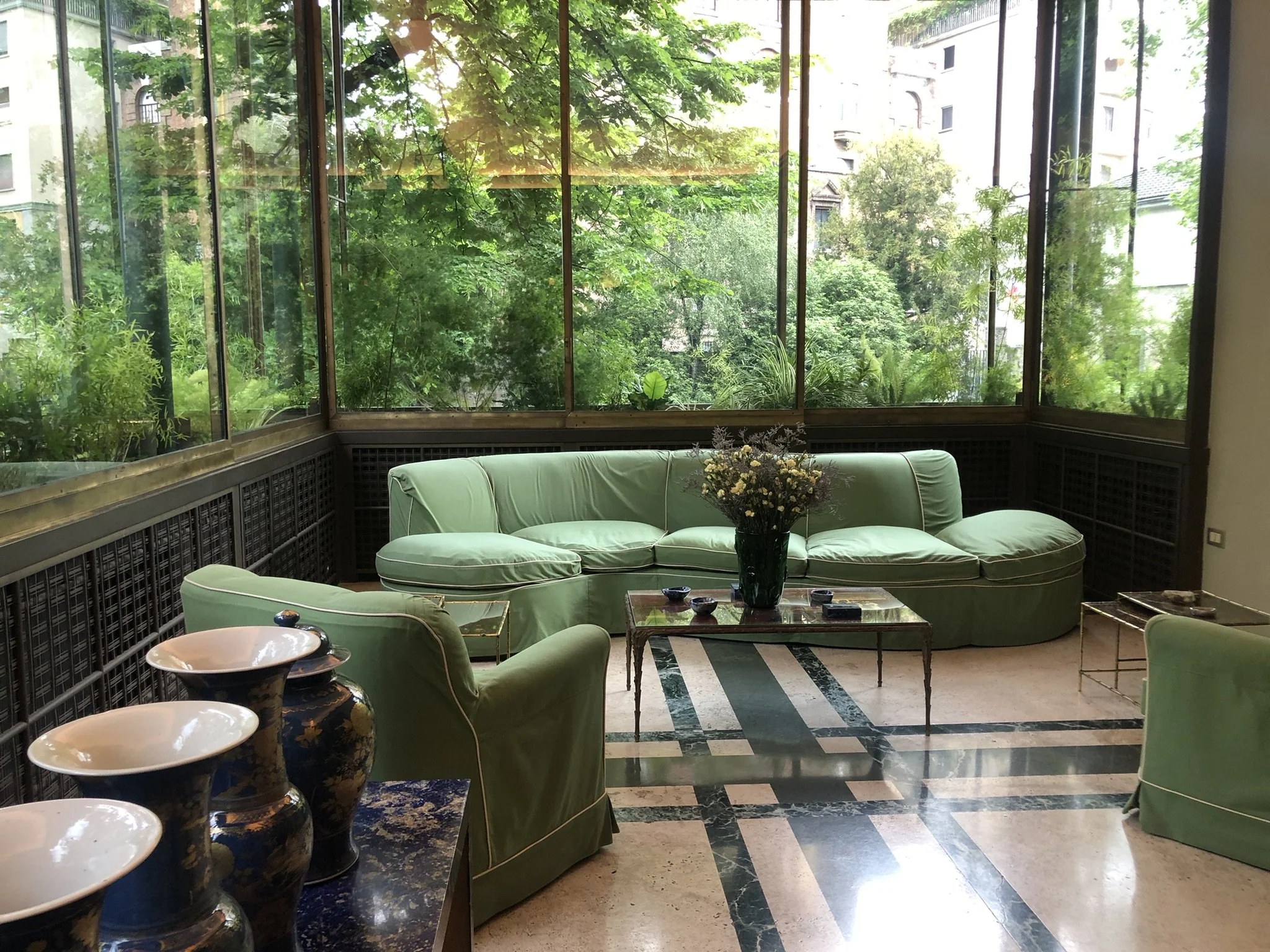 The Veranda, where the architect Pietro Portaluppi designed the marble flooring pattern, recalling the greenery from the garden.