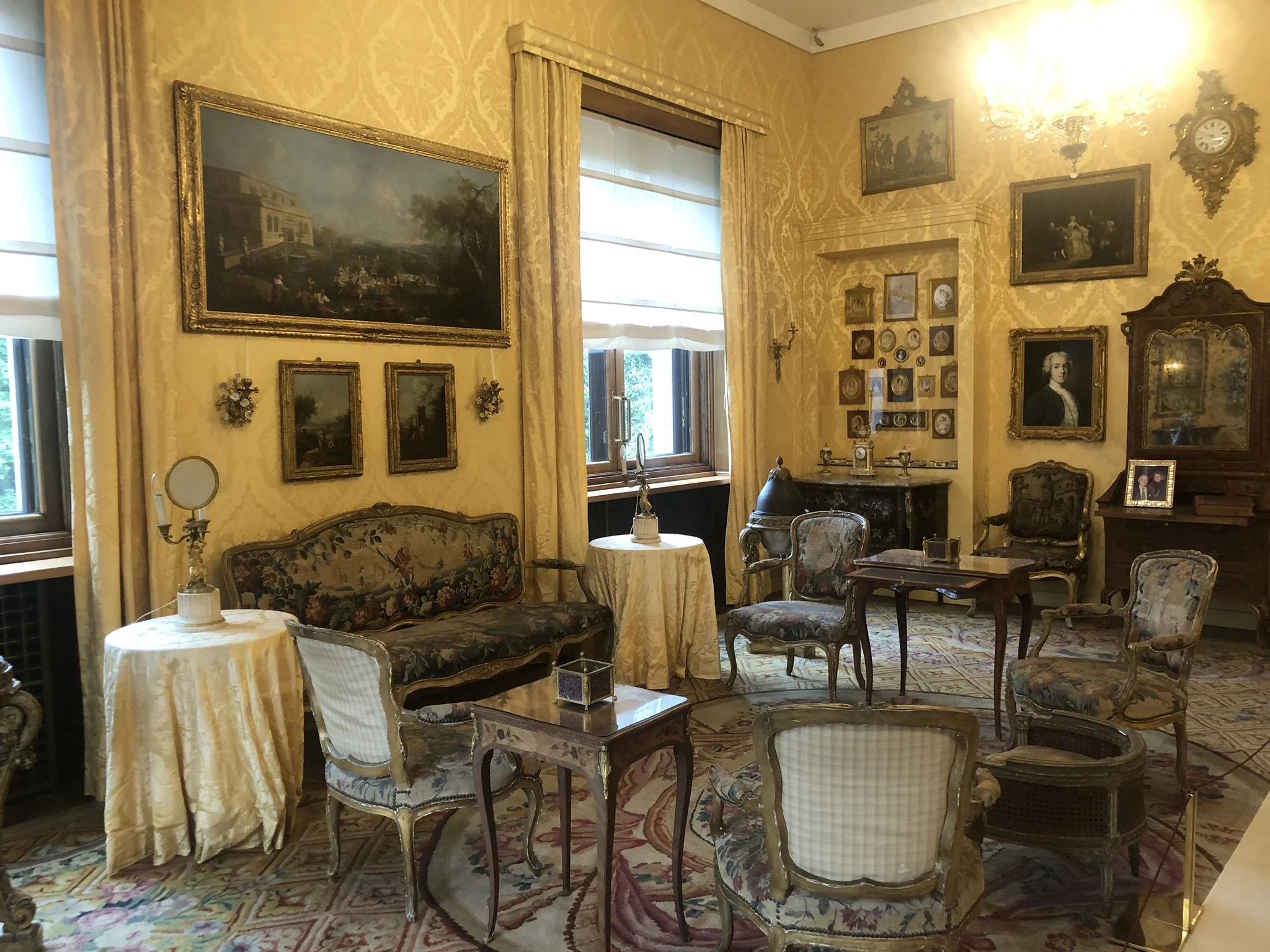 Tea Room at Villa Necchi Campiglio, where the family used to entertain their royal friends, entirely cladded with parsley motif yellow fabric.