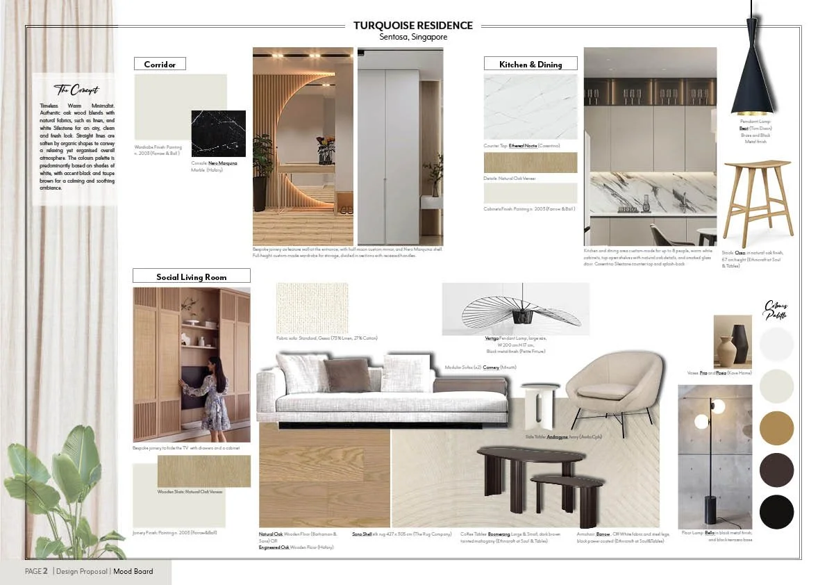 Proposal | The concept is Warm Timeless Minimalist. Authentic oak wood blends with natural fabrics, such as linen, and marble stone for an airy, clean and fresh look. Straight lines are soften by organic shapes to convey a relaxing yet organised overall atmosphere. The colours palette is predominantly based on shades of whites, with accent black and taupe brown for a calming and soothing ambiance.